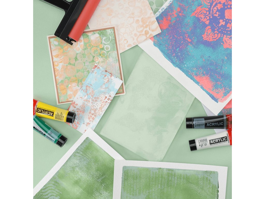 Podložka je skvělá pro výrobu pozadí na přáníčka, plakáty, visačky, obaly, ale i pro zdobení tašek či polštářů. Využiješ ji při scrapbookingu, cardmakingu, art a bullet journalingu, mixed media i dalších kreativních technikách. Můžeš vrstvit barvy i vzory přímo na podložce nebo tisknout postupně po vrstvách. Po použití snadno vyčistíš mýdlem a vodou.
